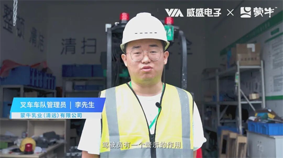 在蒙牛清远工厂,通过加装威盛AI叉车防撞系统,通过前后摄像头识别行人,当黄色警示区、红色危险区出现行人时,分别进行减速和刹车的车辆主动控制,从而提升叉车本质安全。