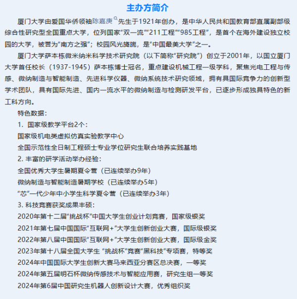 已经成功举办三届的厦门大学“芯”一代少年中小学生科学营,经过不断优化改版,2026年寒假将继续举办冬夏令营,专注“中小衔接”拔尖创新人才培养,以趣味性为主旨,从大咖接地气的讲座开始、结合先进仪器动手实验,全链条、全流程将课堂中的知识无痕融入前沿高端应用,为中小学生们带来全“芯”体验!通过专家授课、技术体验、团队协作、校园探索等方式,带领营员们探索“微纳米级精度”与“AI赋能制造”的无限可能,为培养未来科技领军人才奠定基础。